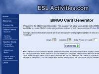 ![]() We thank you for visiting ESL Activities.com. Please understand that ESL Activities.com is still under construction. We are constanly building and adding new activities and teacher tools however development is slow due to limited time and resources. Please consider making a donation to help us continue development. If you would like to email us with questions about the site please visit our contact page. Please continue to check back periodically for new additions to the site. Welcome to the BINGO Card Generator. This program will allow you to create sets of BINGO cards using text. |